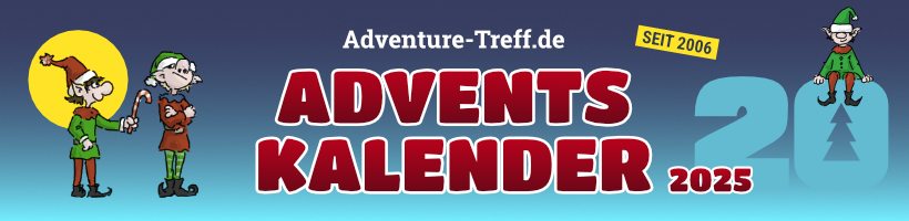 Der Adventure-Treff-Adventskalender, das härteste Rätsel der Adventure-Welt, startet in seine 20. Auflage! Zum 20. Mal verkürzen wir die Wartezeit bis Weihnachten mit 24 knackigen Rätseln. Zum 20. Mal verlosen wir jede Menge Gewinne. Und zum 20. Mal sorgen wir gleichermaßen für Spaß und schlaflose Nächte bei allen, die mitmachen.
